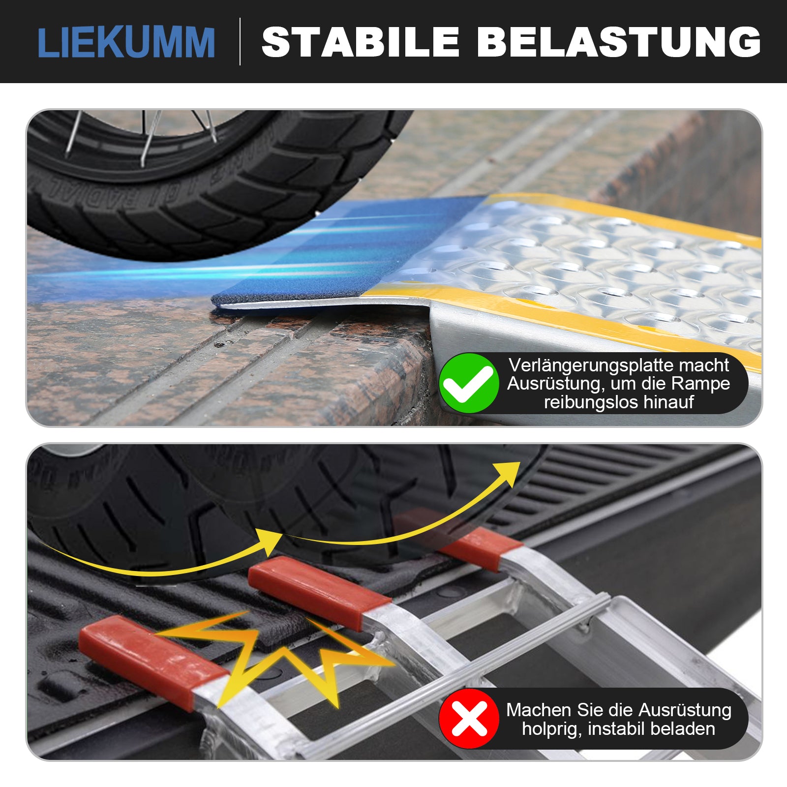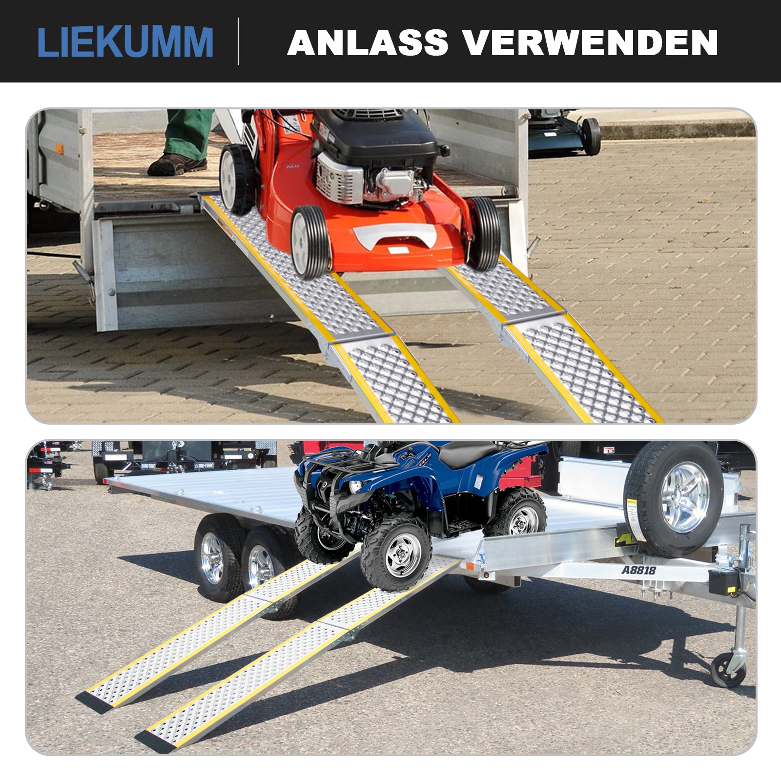 - Vielseitig einsetzbar – passend zur Fahrzeugart: LIEKUMM auffahrrampe wird einzeln verkauft und trägt bis zu 300 kg, ideal für Motorräder, Fahrräder oder andere zweirädrige Fahrzeuge. Für schwerere Fahrzeuge mit vier Rädern wie ATV, Rasenmäher oder Quads empfehlen wir zwei Stück im Set zu verwenden, zusammen tragen sie bis zu 600 kg. Unsere auffahrrampe pkw bietet immer die passende Lösung
