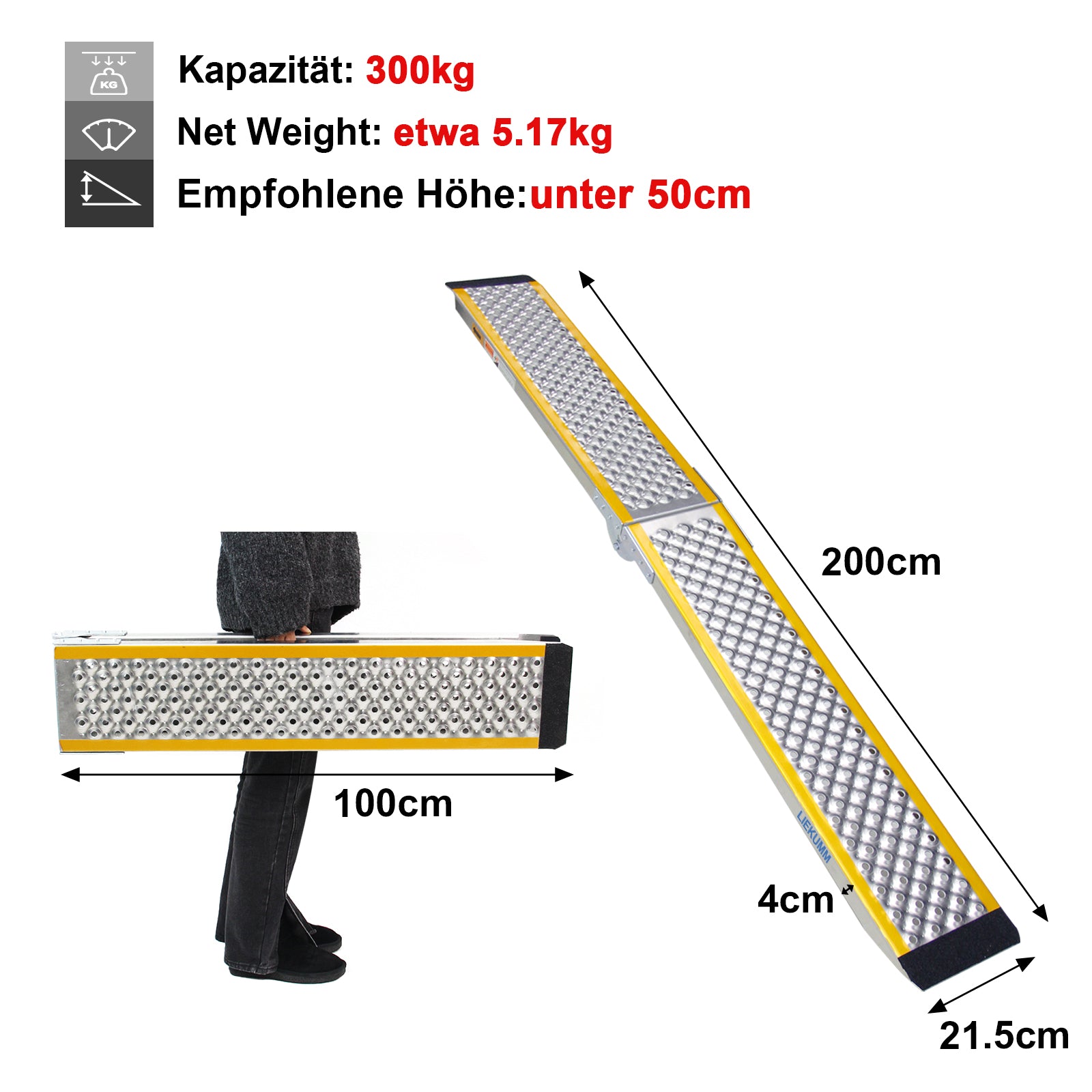 - Maße & Tragfähigkeit beachten: Unsere auffahrrampe misst ausgeklappt 200 x 21,5 x 4 cm, gefaltet 100 x 21,5 x 12 cm. Die maximale Tragkraft beträgt 300 kg pro Stück, empfohlene Nutzungshöhe bis 50 cm. Bitte verwenden Sie die auffahrrampe für anhänger nicht über den empfohlenen Bereich hinaus
