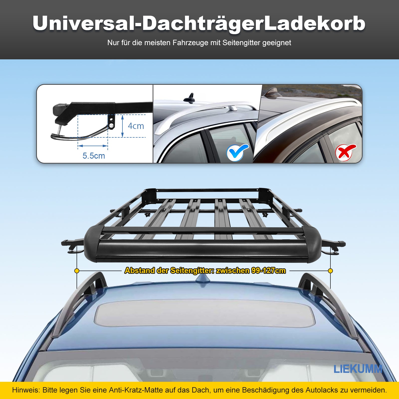 - Universeller Aluminium Dachgepäckträger – Passend für viele Autos:Dieser Aluminium Dachgepäckträger (127 x 97 cm) ist ideal für Fahrzeuge mit Dachreling und geeignet für Dachgepäckträger für verschiedene Autos. Bitte prüfen Sie vor dem Kauf die Art und den Abstand der Dachreling