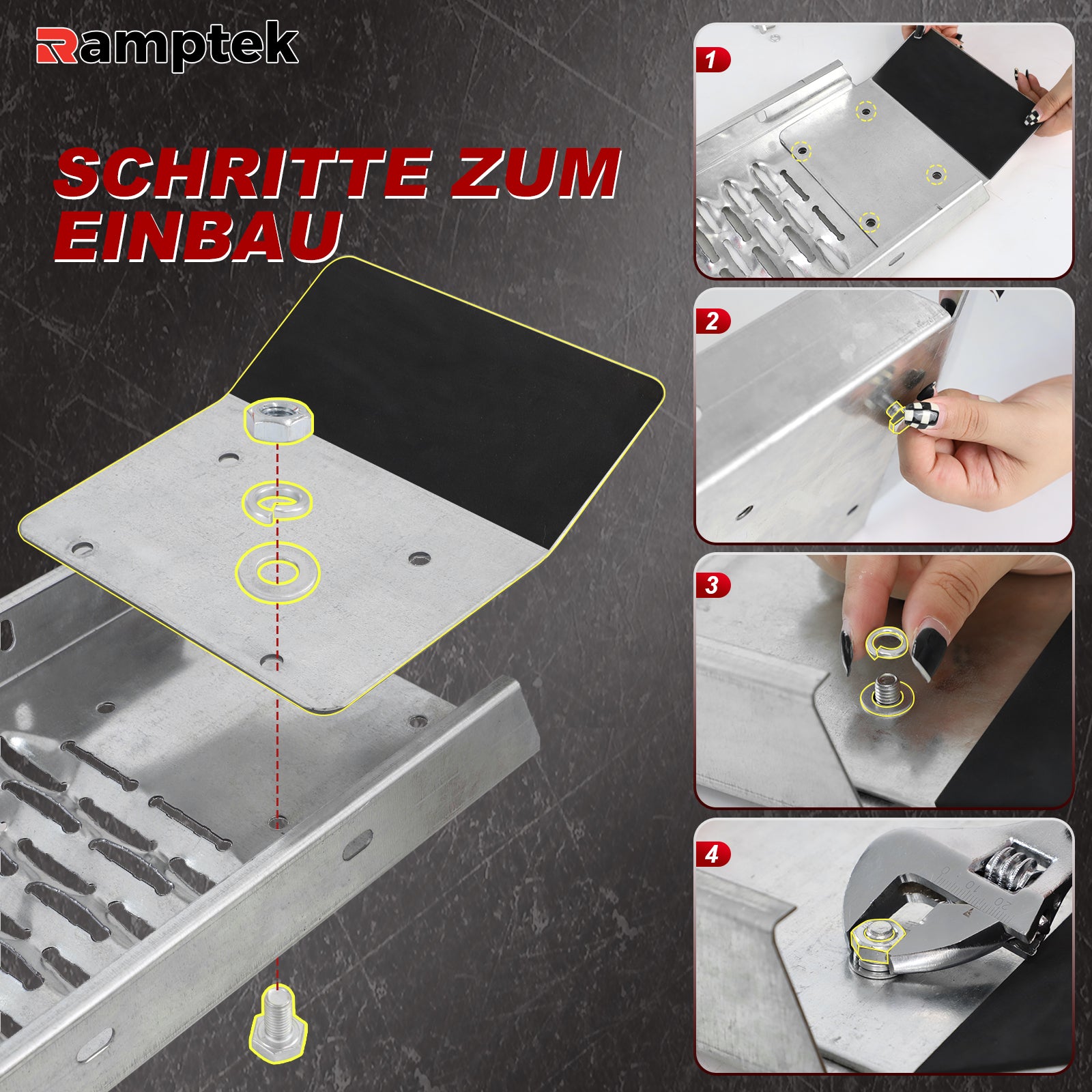 - 【Installationssequenz】 Sobald Sie die Stahl Auffahrrampe aus Stahl erhalten haben, nehmen Sie alle Zubehörteile heraus und installieren Sie das Rampen-Kit oben auf der Laderampe. Die Reihenfolge der Dichtungen ist: zuerst die Dichtung einbauen, dann die Sicherungsscheibe einbauen. Verwenden Sie die Rampe, nachdem Sie sich vergewissert haben, dass die Installation sicher ist.